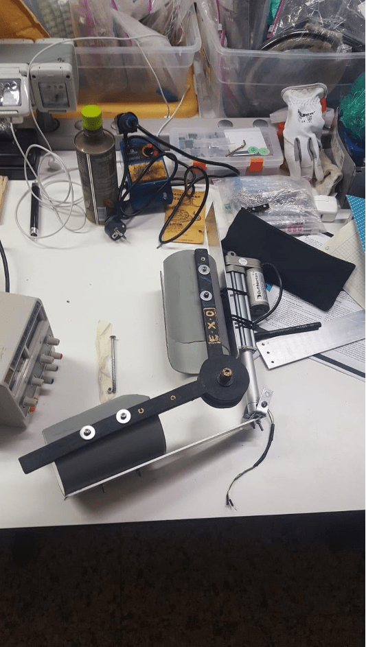 One last problem that was revealed at the end was that the opening arc was not too small but too low, in fact the arm went from completely relaxed, perpendicular to the ground, to about a 90° angle, it was therefore decided to move the actuator forward, to allow it to go from about an angle of just under 90° to higher, to accomplish this process it was necessary to stretch an aluminum plate that held the actuator in place. However, an unforeseen problem arose when we moved the actuator forward; it tended to rotate not on the pivot we had built, but on a point of the plate; this movement, if restrained, could lead to the breakage of the arm.