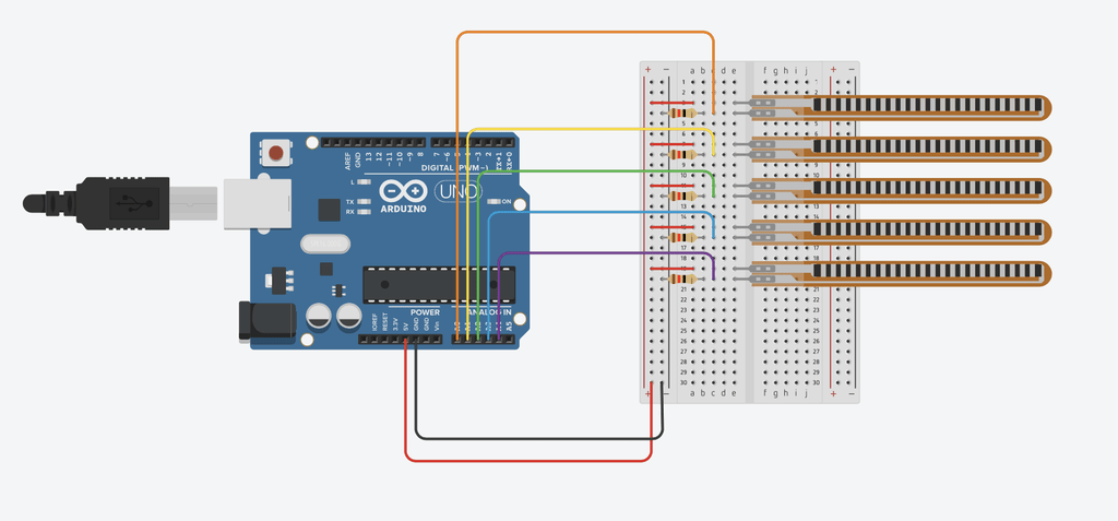 Once their functioning has been ascertained it’s necessary to test the circuit as well. Our instrument is based, as said in the introduction, on a simple circuit: the positive cable of each flex-sensor connected to the Arduino 5V port while the negative conducted both to the pin corresponding to the sensor and through a sensor to ground (Check the Tinkercad circuit and reply it on your board).